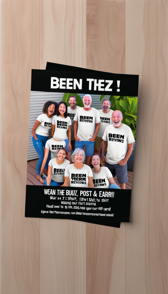 Post pics and videos of yourself wearing our Been There Reviews T-shirt on social media and earn $10.00! Plus, join our affiliate program to earn more with every sale made through your referral code.